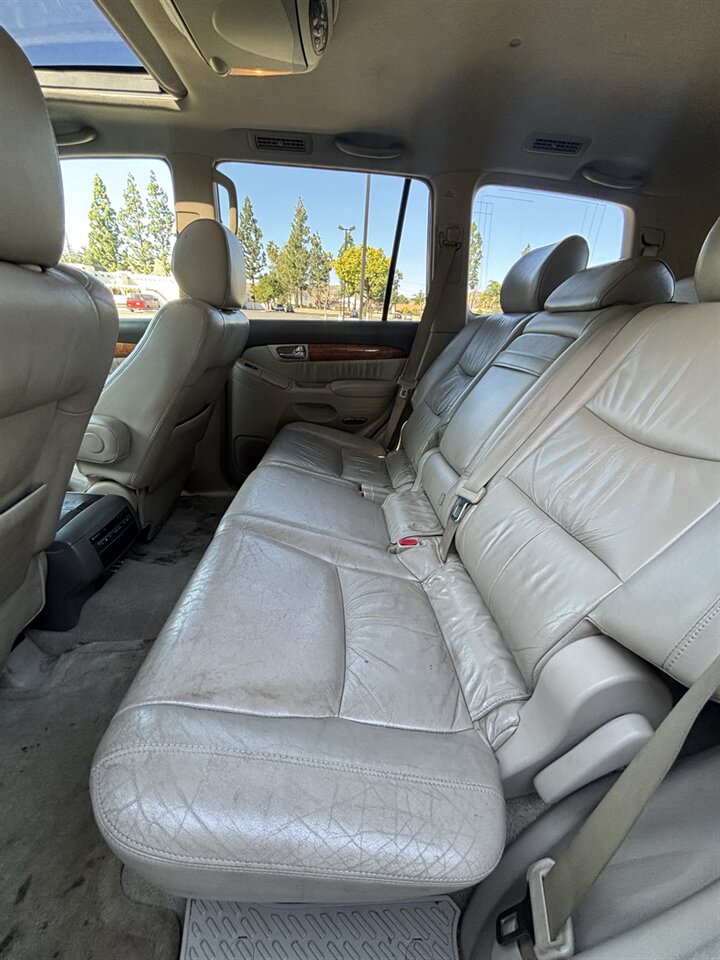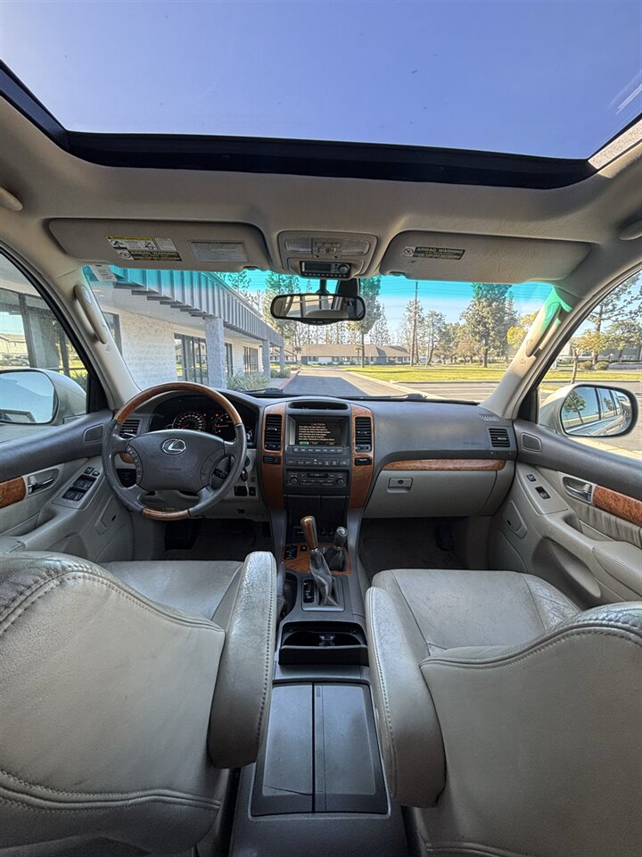 Inside, the Ivory leather creates a bright, inviting cabin that complements the wood trim accents on the dash and steering wheel. Seating is comfortable and supportive for longer drives; the front seats are power-adjustable and many GX 470s were factory-equipped with heated front seats and driver memory settings for added convenience. The seating layout can be versatile — depending on the original build, many models accommodated optional third-row seating for extra passengers or folded flat to expand luggage capacity.