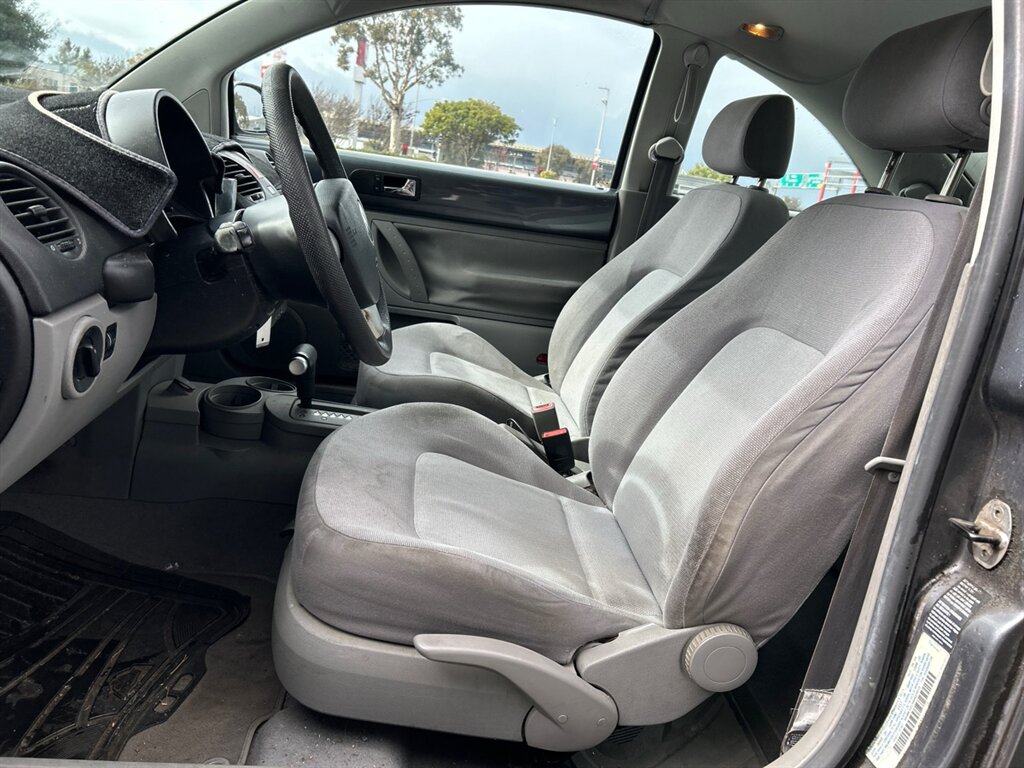The exterior is finished in Platinum Gray Metallic — a sophisticated, understated color that accentuates the Beetle’s rounded, retro-modern styling. The paint’s metallic flake adds depth and a premium sheen in sunlight, while the classic Beetle silhouette with its curved roofline, prominent fenders, and expressive headlights gives this car a distinctive, friendly personality. Trim, glass, and exterior fittings are in excellent condition, reflecting careful ownership. The compact footprint and tight turning radius make parking and urban driving effortless.