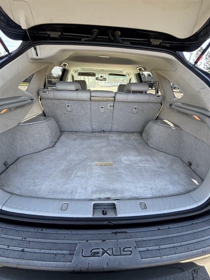 The Black exterior presents a classic, upscale appearance that wears well over time. Subtle styling cues — sculpted body lines, integrated rear spoiler, projector-style headlight housings, and fog lamps — give the RX a premium stance. Functional details like a power liftgate/rear hatch, rear wiper/washer, privacy glass, and roof rails (typical factory equipment) add versatility for daily life, errands, and road trips. The exterior shows the care this vehicle has received and is in excellent overall condition.